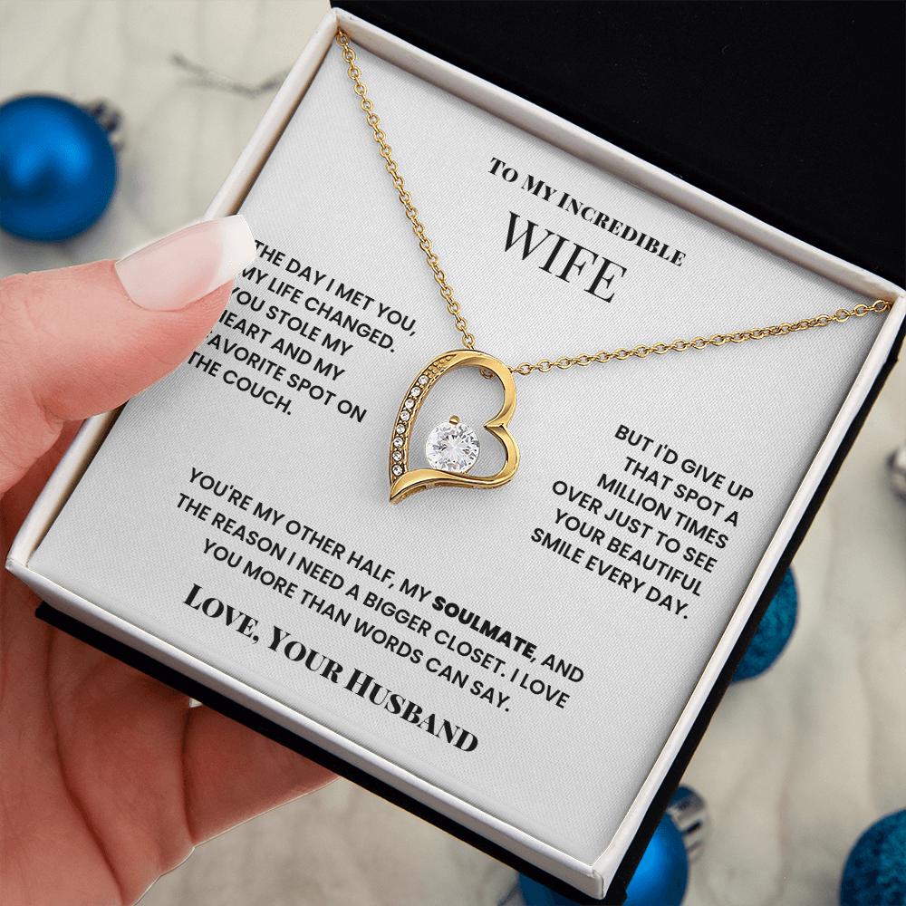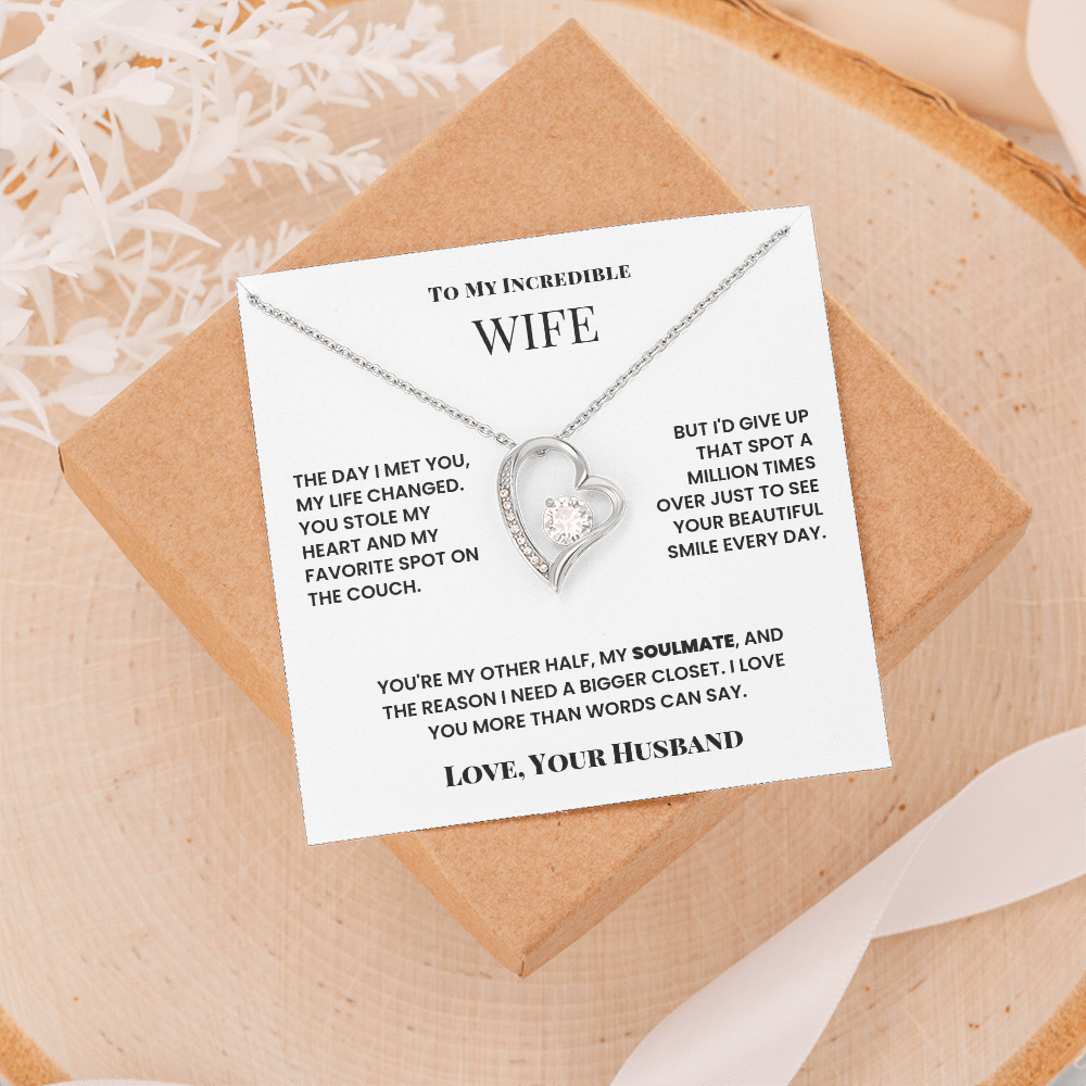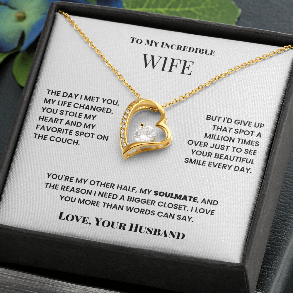 To my incredible wife, The day I met you, my life changed. You stole my heart and my favorite spot on the couch. But, I'd give up that spot a million times over just to see your beautiful smile every day. You're my other half, my soulmate, and the reason I need a bigger closet. I love you more than words can say. Love, your husband.